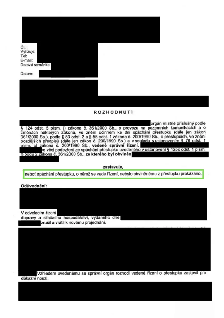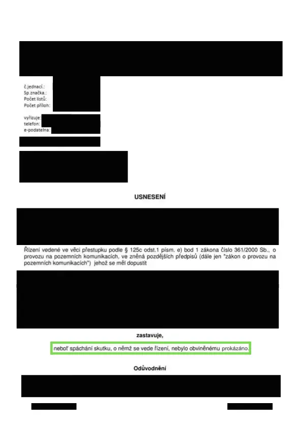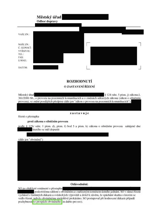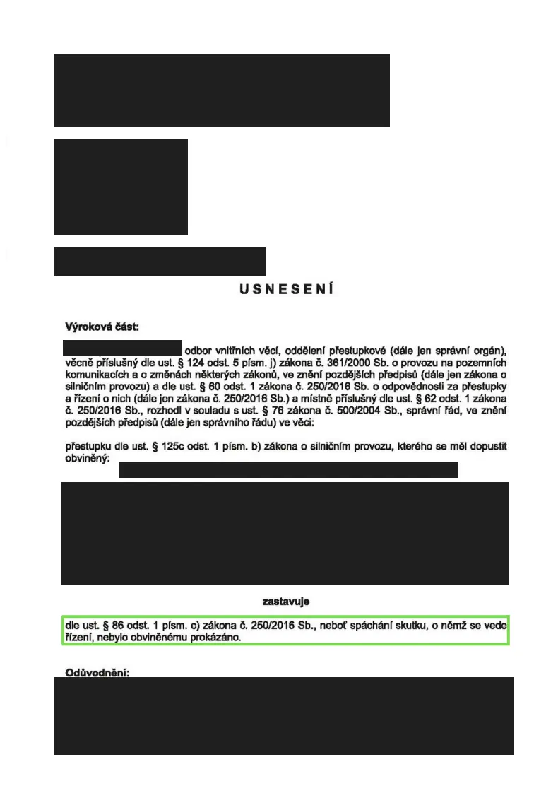 Klient byl obviněn z výrazného překročení rychlosti – o více než 40 km/h v obci, případně o více než 50 km/h mimo obec. Hrozila mu pokuta 7 000 až 25 000 Kč, 6 bodů a zákaz řízení na 6 až 18 měsíců. Díky naší obhajobě bylo správní řízení zastaveno a klient tak nepřišel o řidičský průkaz.