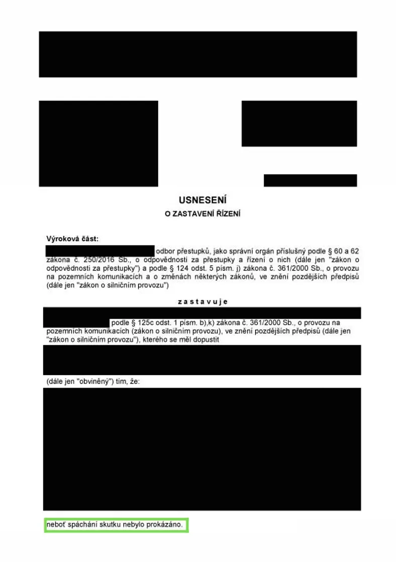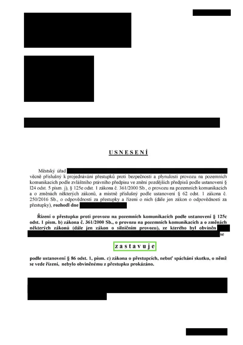 Klient byl obviněn z výrazného překročení rychlosti – o více než 40 km/h v obci, případně o více než 50 km/h mimo obec. Hrozila mu pokuta 7 000 až 25 000 Kč, 6 bodů a zákaz řízení na 6 až 18 měsíců. Díky naší obhajobě bylo správní řízení zastaveno a klient tak nepřišel o řidičský průkaz.